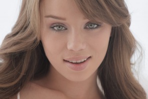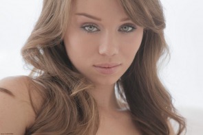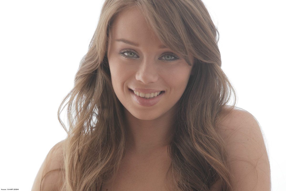 Alexis Capri in white lingerie on white sheets and pillows, everything is sexy white.