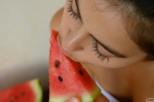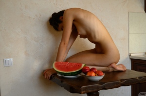 Dark haired yoga fan Alissa Foxy posing nude with fruits on the table. See more at Zishy.