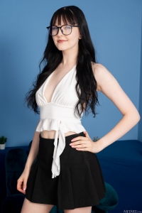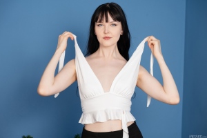 Amelia Riven with blue eyes, black hair and pale skin taking off her top and short skirt to pose nude. See more at Met Art