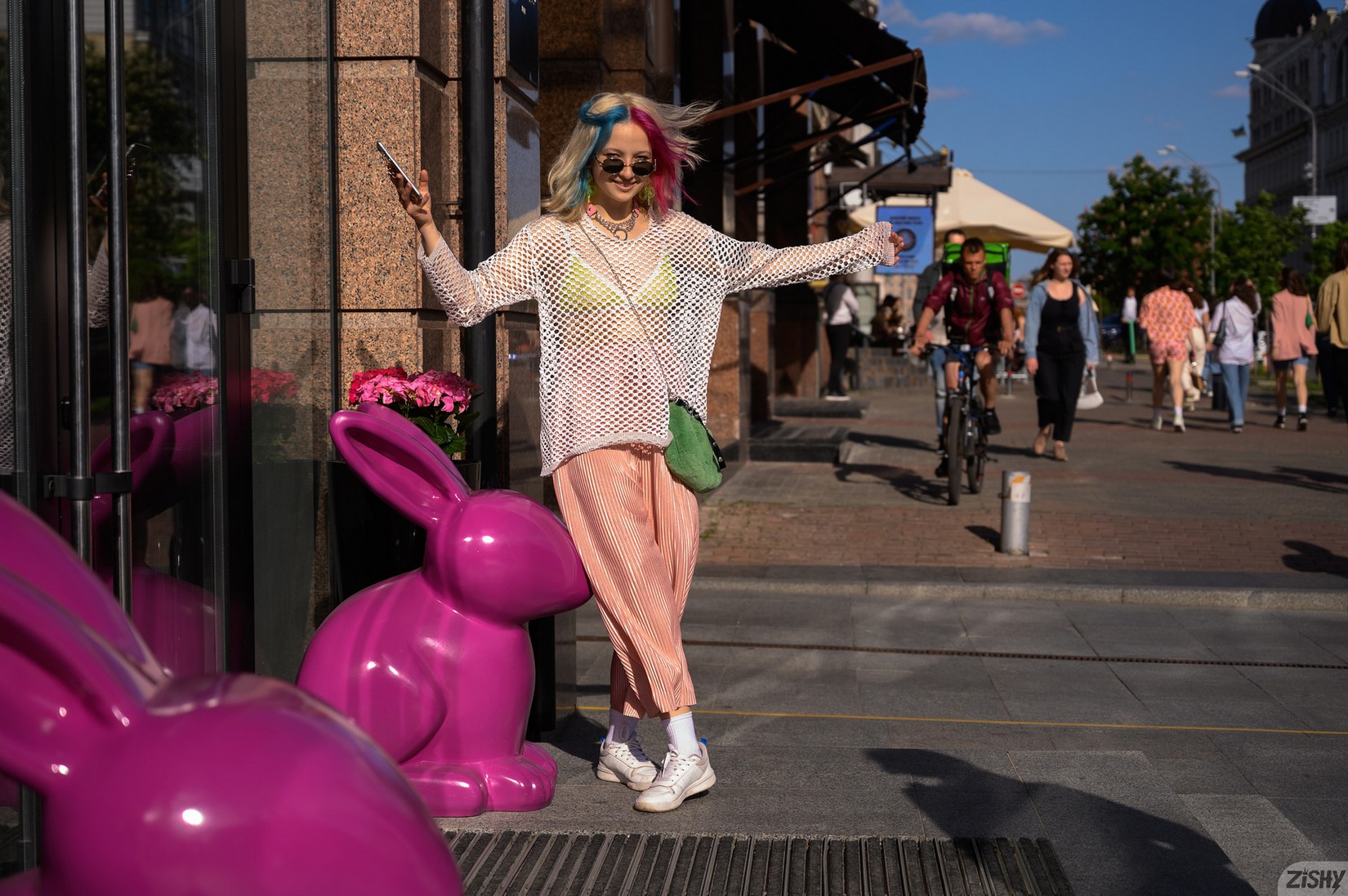 Lily Vei (multicolored hair) and Polina Pafio having some lesbian joy on bed after a walk. AKA Taya Helenova and Letty Steine at Zishy.