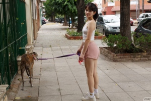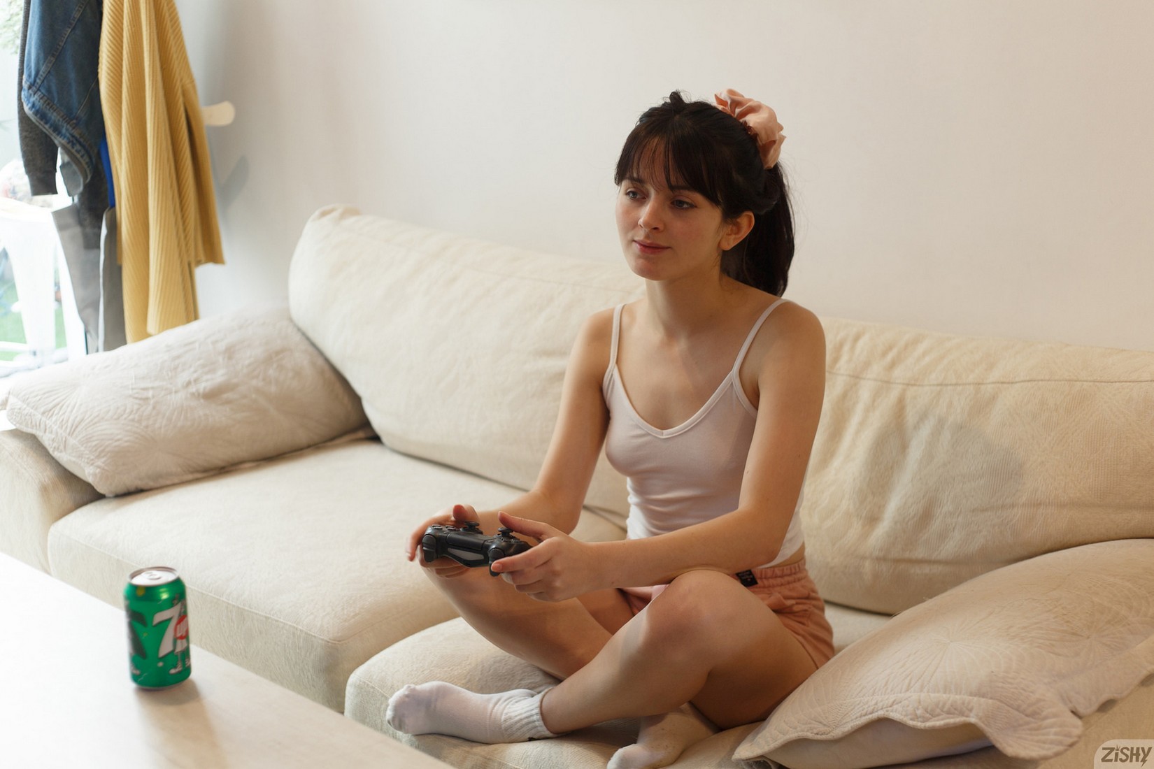 Luci Pineda with small tits plays video games and removes her clothes after walking her beautiful dog. See more at Zishy.