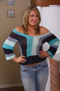 Mia Moore wears red panties under jeans, she strips it off and spreads her ass cheeks on the kitchen. See more of Mia Moore at KarupsHA.