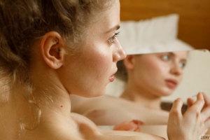 Mitropoliya observes her sexy nude body in the mirror as she laying on the white sheets. See more at Zishy
