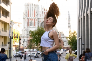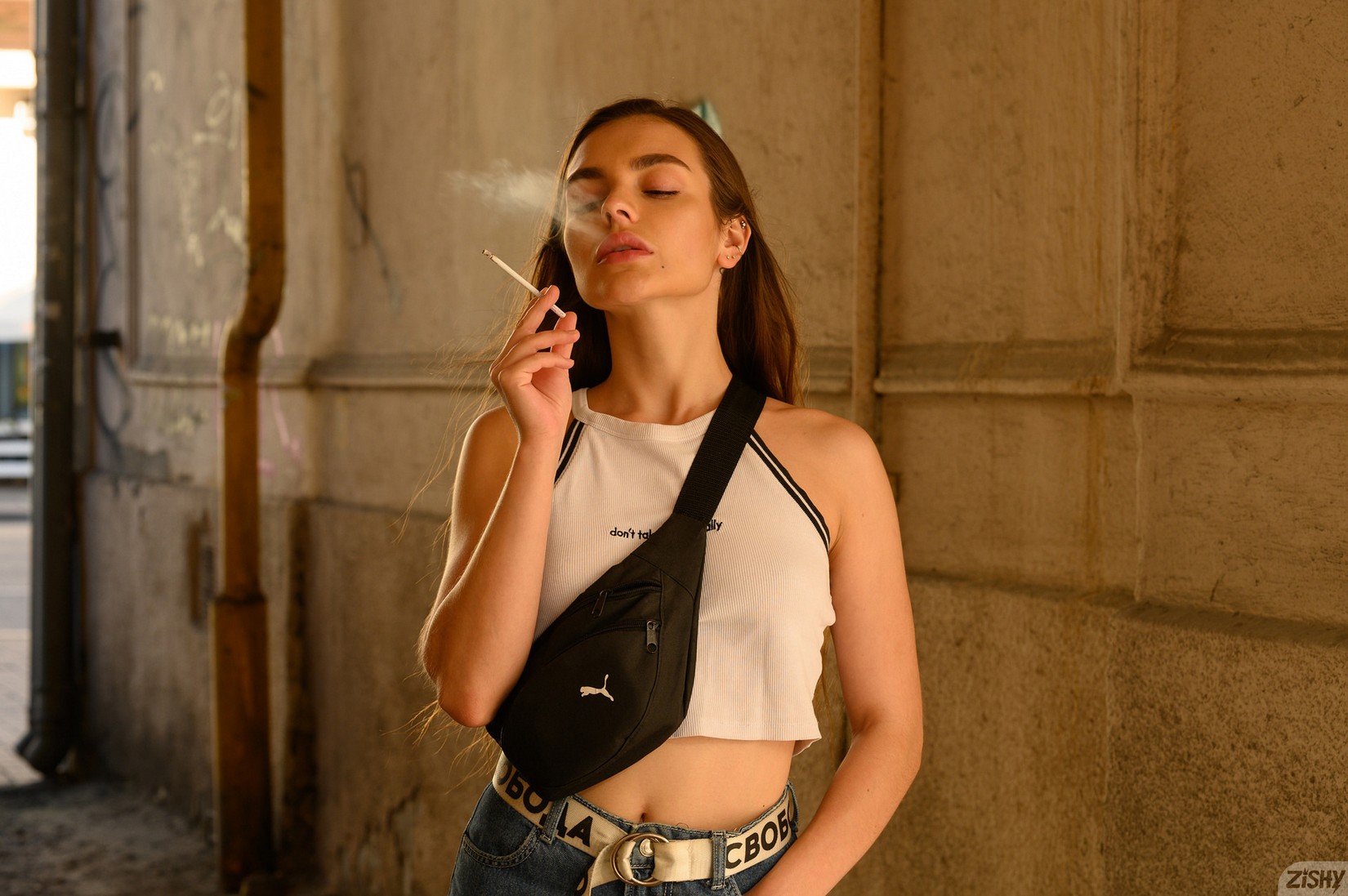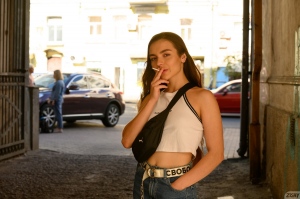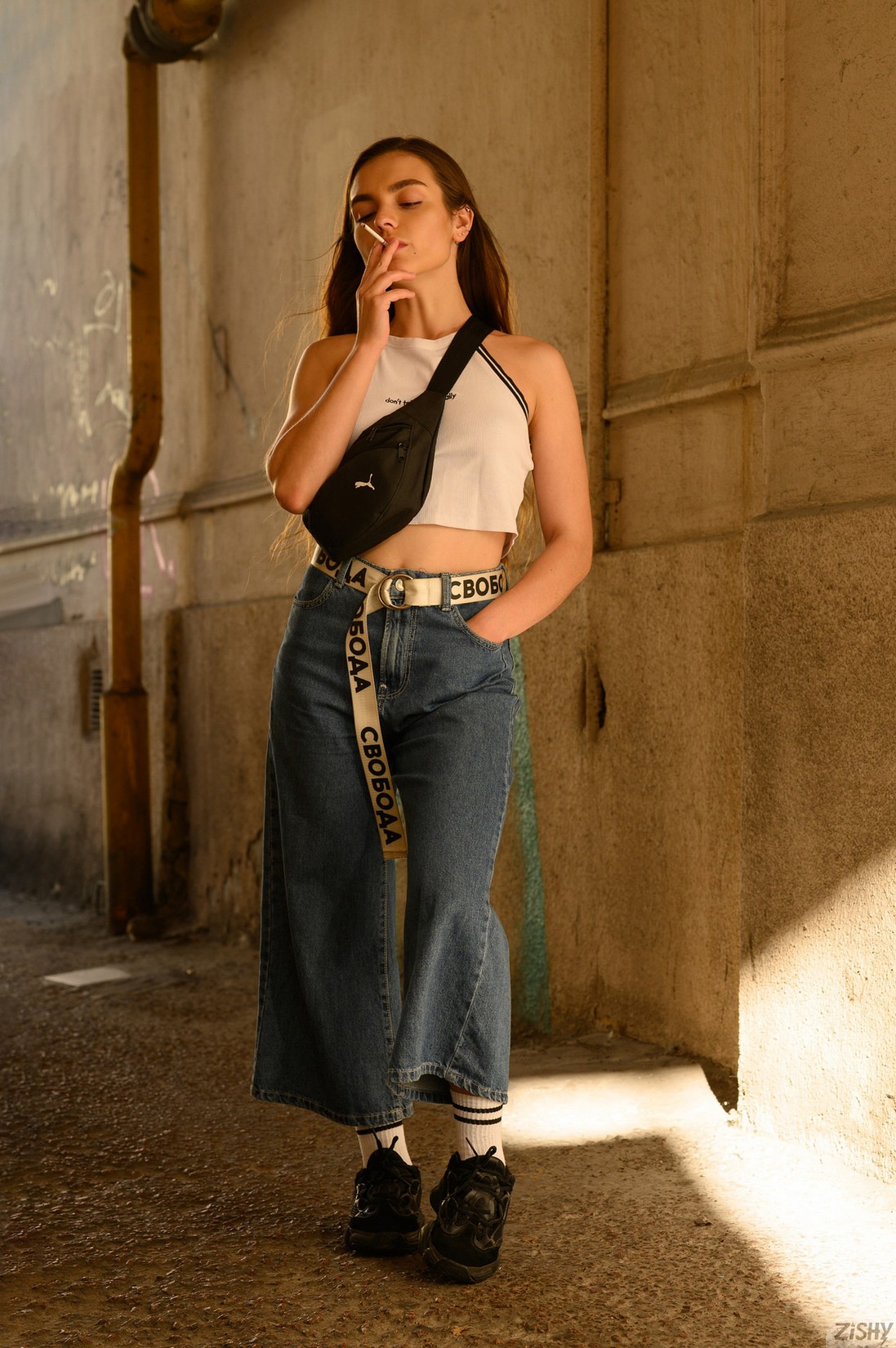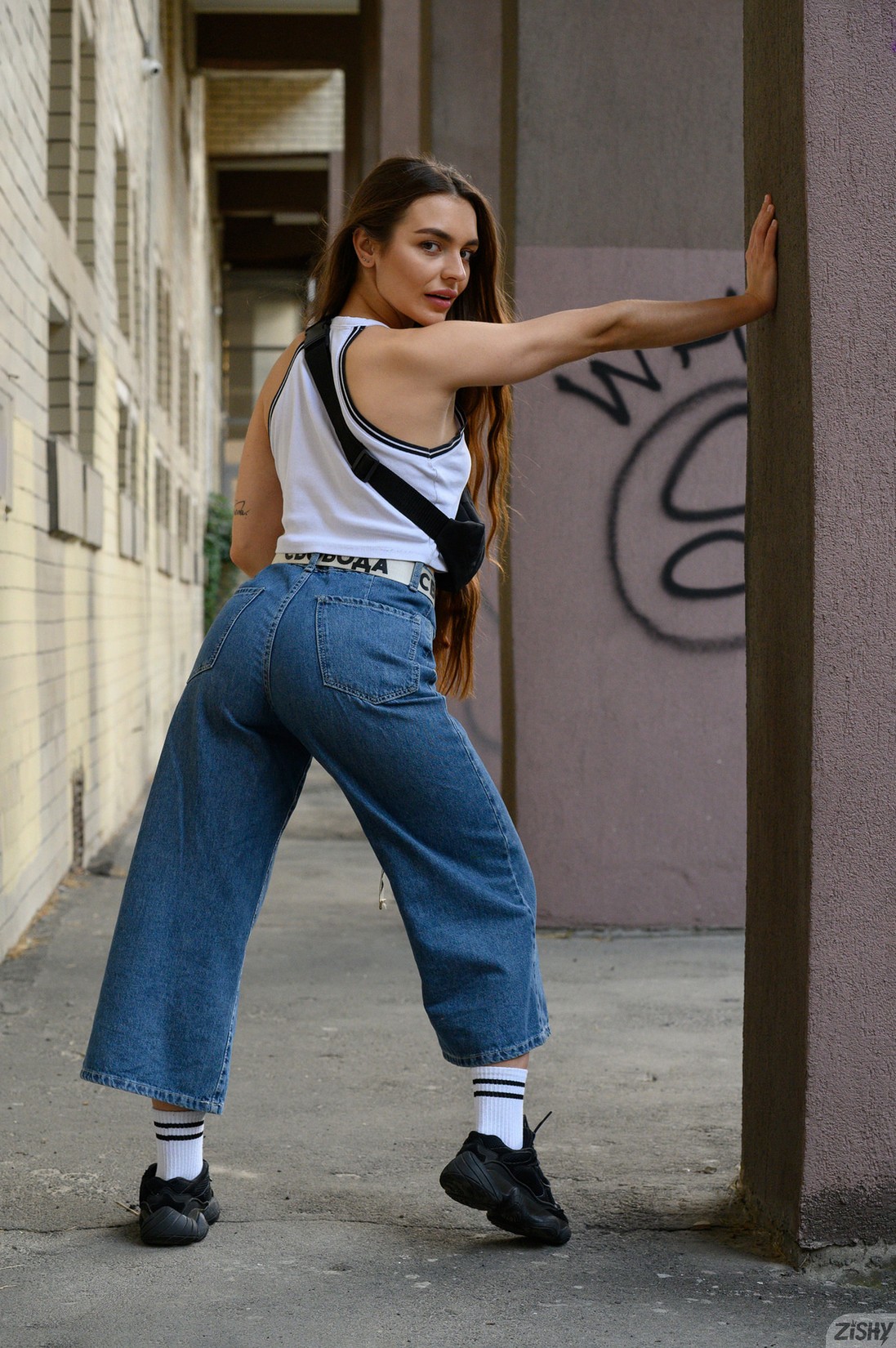 Monica Trent (AKA Rachel Veiss) taking off her blue jeans leaving black lace panties on. See more at Zishy