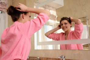 Monika Dee taking her pink bathrobe off and showing her sexy curves.