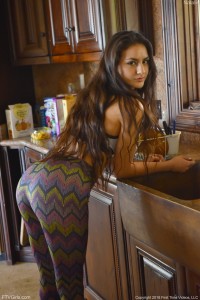 Brunette Natalie pulling down her yoga pants in kitchen and masturbating. See more of her at FTV Girls