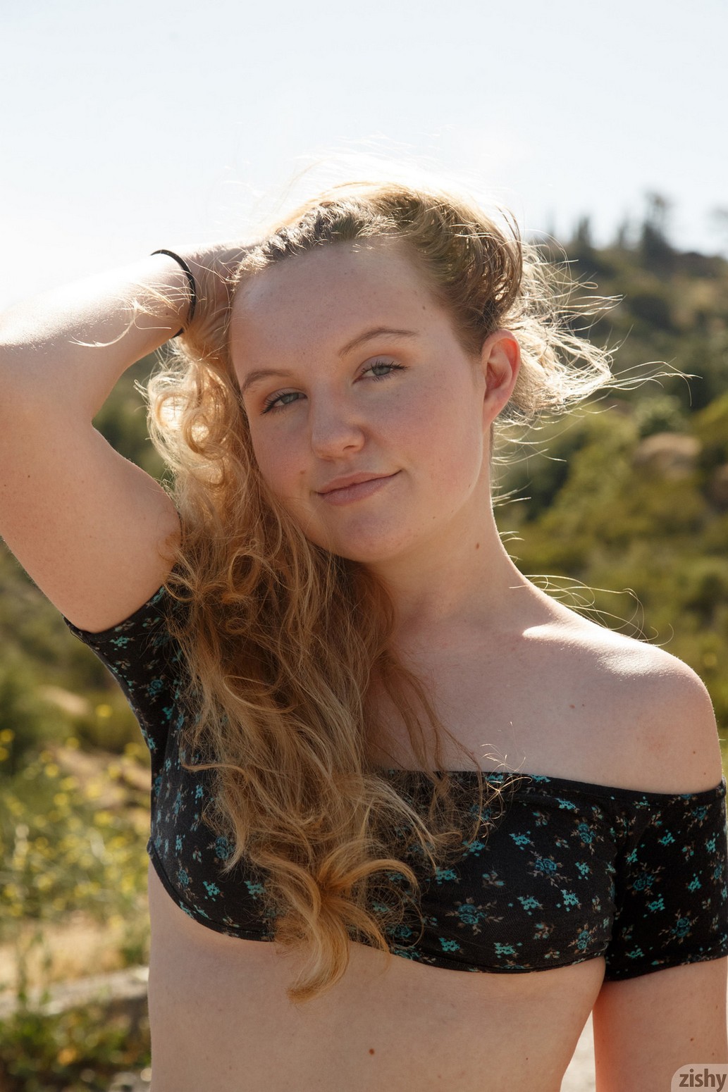 Redhead Oakley Jacobs tiptoes outdoors in red shorts that she removes moments before she removes her pink bikini bottom as well. For more, continue to Zishy.