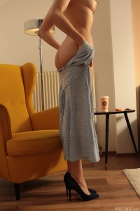 Olivia Linz in glasses and high heels slowly taking her dress off. See more of her at Met Art