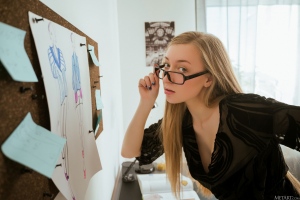 Cute babe Sailor with long hair getting nude as she working in office. See more of her at Met Art