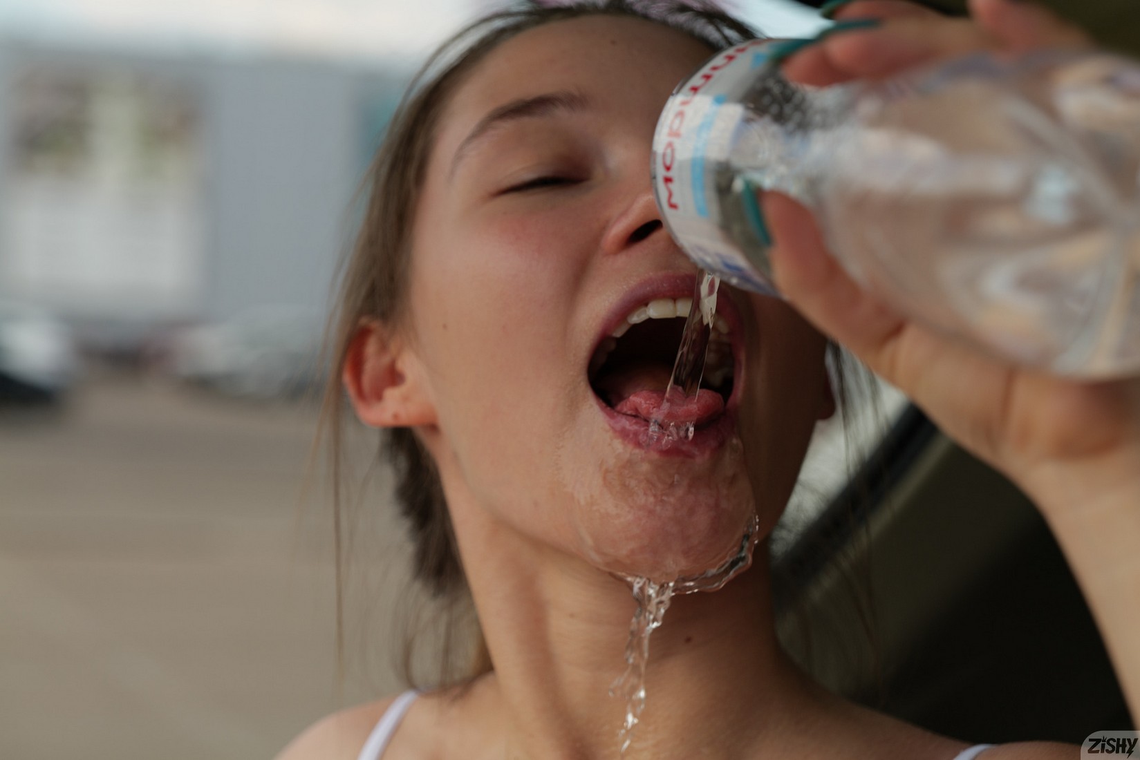 Sayah Heaney wearing a thin white bra and panties that is soaked with water. See more of her at Zishy